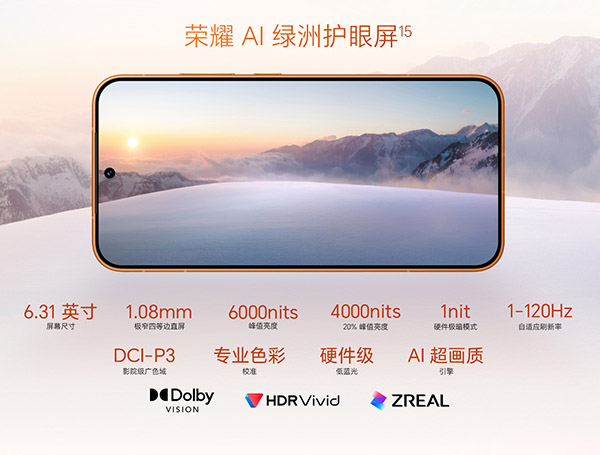 屏幕:6.31英寸,分辨率是2640×1216(属于1.5K级别),OLED直屏,支持1-120Hz高刷新率,LTPO技术,461ppi,全白峰值1800尼特,局部峰值亮度6000尼特,1nit硬件极暗模式,真10.7亿色,DCI-P3影院级广色域,4320Hz高频PWM调光,1.08mm边框四等边巨犀玻璃;