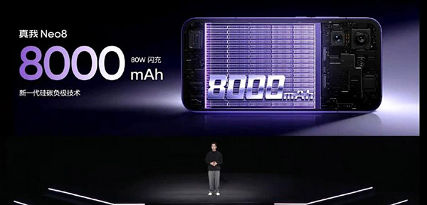 realme真我Neo8直接将电池拉到8000mAh,还是在单层主板的机身里实现,这背后必然是结构设计的重构,对比友商同定位机型,电池容量提升幅度超40%,足以覆盖绝大多数用户的全天需求。