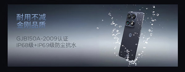 IP68+IP69级别防水,联想moto X70 Air Pro通过了GJB150A-2009中国军用标准 的14项严苛测试,并具备 IP68+IP69顶级防尘抗水 能力,轻薄之余不失坚固可靠。