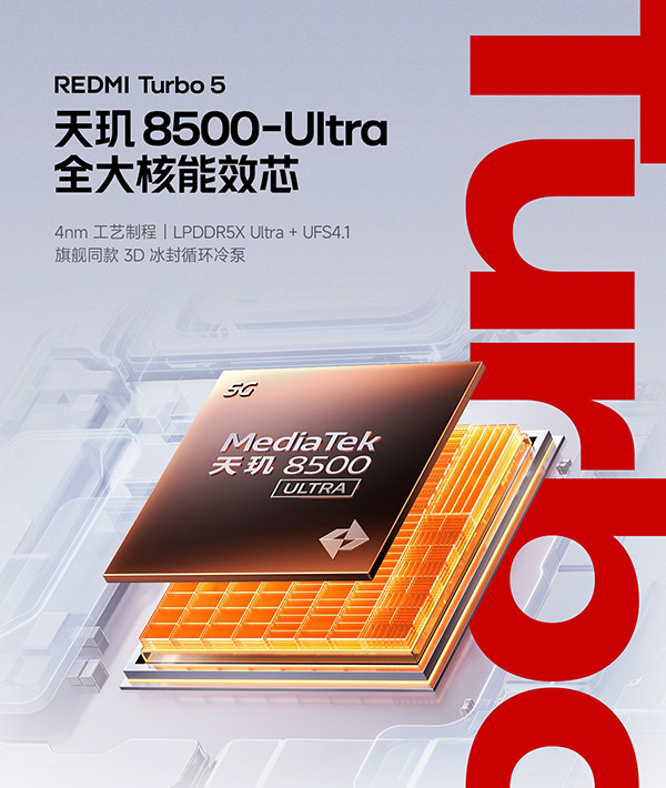 细节方面,Turbo5系列也毫不妥协,该机保留了侧边指纹识别、X轴线性马达、立体声双扬声器等实用配置,电源键、镜头装饰圈及品牌标识等细节处融入红色元素,呼应新春时节的喜庆氛围。