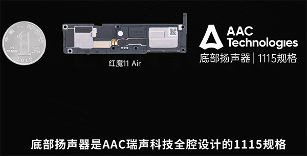 音效方面,红魔11 Air配置的立体双扬声器,顶部是瑞声科技1014D规格,底部是瑞声科技1115规格。
