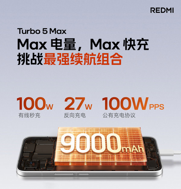 支持,红米Turbo5 Max内置9000mAh的超大容量电池,这块电池的能量密度达到了894Wh/L,含硅量为16%,它还配备旗舰同款100W快充,并且还支持最高27W有线反向充电功能。