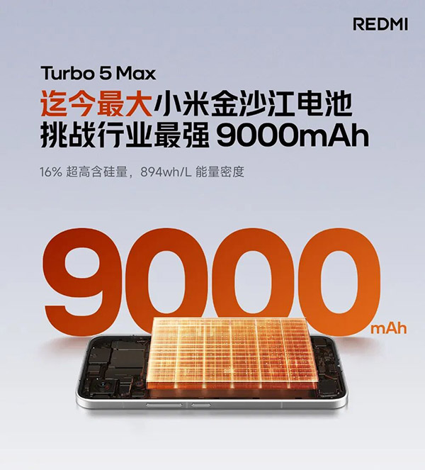电池方面,红米Turbo5 Max内置9000mAh的超大容量电池,这块电池的能量密度达到了894Wh/L,含硅量为16%。