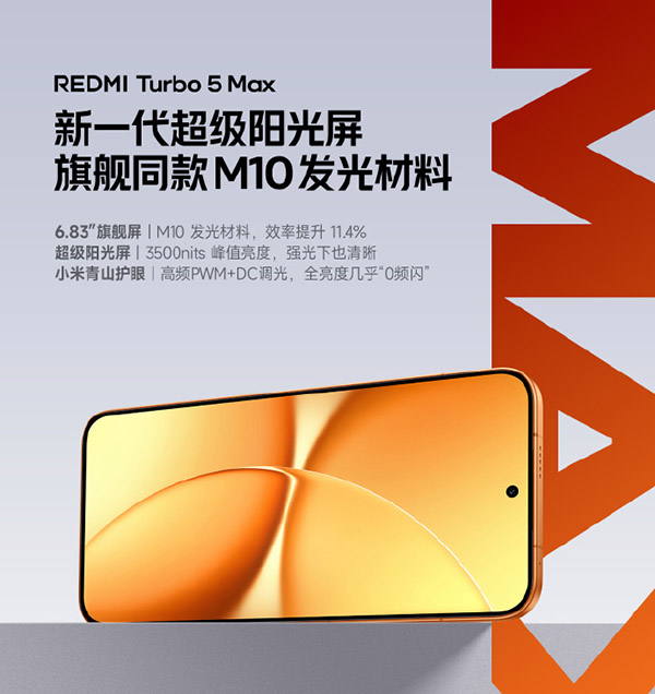 红米Turbo5 Max搭载新一代超级阳光屏,3500nits超高亮度,有效提升强光下可读性,华星光电M10发光材料,显著提升发光效率与寿命,小米青山护眼,3840HzPWM+DC调光。