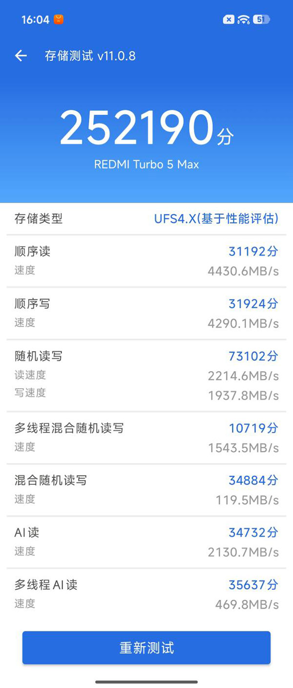 红米REDMI Turbo5 Max配备了旗舰级别的LPDDR5X Ultra+UFS4.1的储存组合,储存测试得分为252190分,其中顺序读取速度为4430.6MB/s,顺序写入速度为4290.1MB/s,随机读写分别是2214.6MB/s和1937.8MB/s,多线程混合随机读写为1543.5MB/s,混合随机读写为119.5MB/s,AI读取2130.7MB/s,多线程AI读取469.8MB/s。