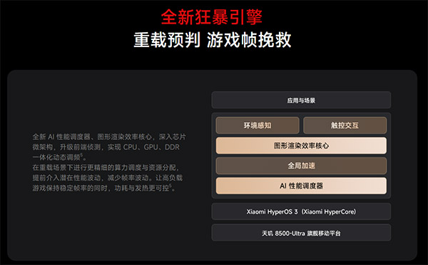 也就是说,红米Turbo5搭载的是联发科天玑8500-Ultra芯片,并没内置独显芯片(Max版本也是没有独显芯片的),不过它内置有狂暴引擎,通过SoC一体化调频与编译优化技术,在重载场景下实现了极致稳帧。