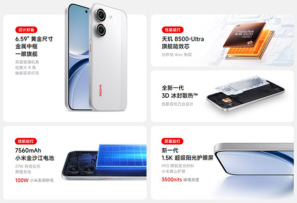 这次的中端机红米Turbo5还是比较有特点为的,它采用6.59英寸旗舰中屏,并且塞入了7560毫安时大电池,整机还拥有满级防水、金属中框、玻璃背板和旗舰级别存储组合,喜欢性能和长续航的千元机用户不要错过了。