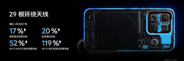 29根环绕天线,无论在通信网络还是WiFi状态,iQOO15 Ultra性能均较iQOO15有明显提升。
