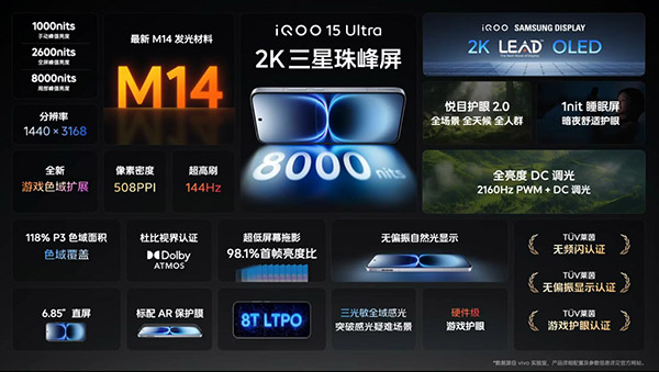屏幕:6.85英寸,分辨率是3168×1440(属于是2K级别),OLED直屏,屏幕供应商是三星,三星M14发光材料,144Hz高刷新率(1-144Hz 8T LTPO),屏占比94.37%,像素密度508PPI,480Hz多指触控采样率,4000Hz瞬时触控采样率,手动最高亮度1000nit,全屏激发亮度2600nit,局部峰值亮度8000nit,最低亮度1nit,低亮度2160Hz高频PWM调光(高亮度类DC调光),还支持全亮度DC调光,无偏振光护眼(极度省电+长寿命,唯一缺点是户外强光下的对比度偏低,要配合AR膜食用),悦目护眼2.0,获得莱茵游戏护眼认证、莱茵无频闪显示认证、莱茵无频闪认证,118% DCI-P3广色域,10.7亿色,对比度8000000:1,获得杜比视界认证,3D超声波指纹识别;