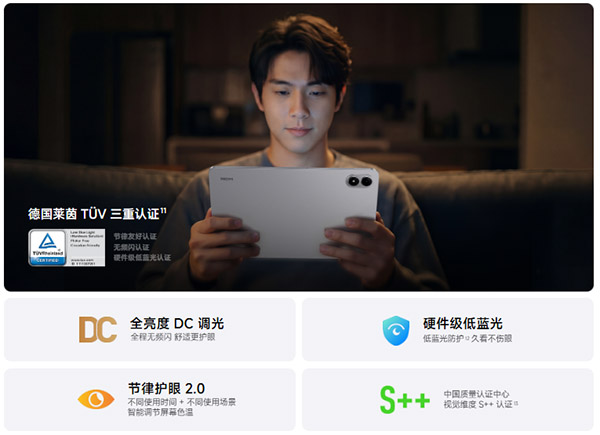 护眼方面也是红米Pad2 Pro的一大优势,它采用了小米青山护眼方案+全亮度DC调光+硬件级低蓝光,从根源上减少频闪和蓝光伤害,长时间刷题、写论文也不会觉得眼睛干涩。