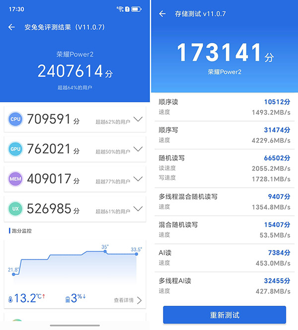 存储测试中,荣耀Power2得分173141分,具体各项成绩如下: