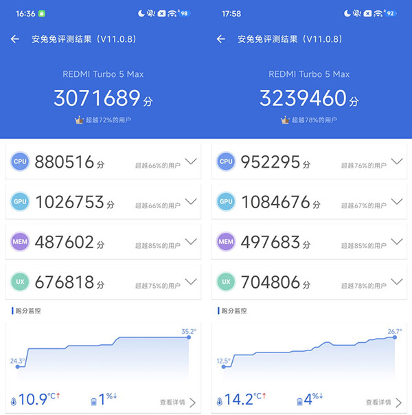 我们手头这台16GB+1TB的Turbo5 MAX常温环境的安兔兔V11测试中,可以跑到超过307万分的综合成绩。在低温环境下,综合成绩能达到323万9460分,差异度大约为5.4%。