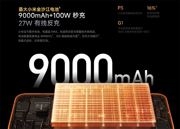 这块电池用上了优化的G3球形硅碳,搭配4.55V高电压电池体系和能量槽3.0技术,使得电池的能量密度来到894Wh/L,是小米体系里面能量密度最高的电池,从而让它能够塞进8.15mm厚的手机里面。