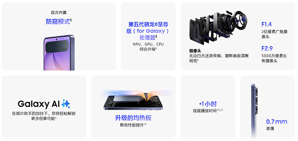 性能:首发搭载第五代骁龙8至尊版for Galaxy(超大核4.61GHz→4.74GHz,GPU从1.2→1.3Ghz,也就是超频版本的骁龙8 Elite Gen5);