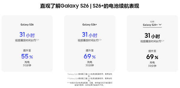纵观S26系列的配置,三星Galaxy S26标准版4300mAh电池配25W有线充,S26+为4900mAh配45W有线充,Ultra版5000mAh配60W有线充,这样的充电规格在国内市场显然落后于主流国产旗舰。