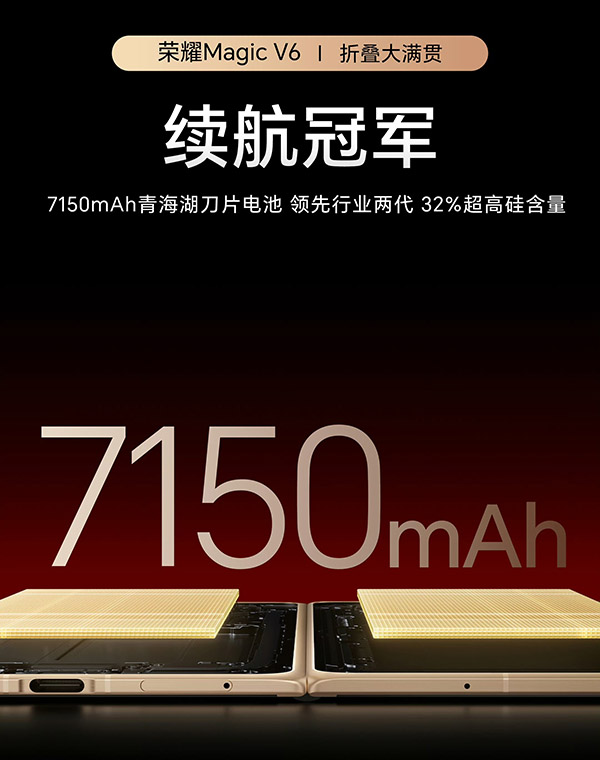 常规版本是947Wh/L,1TB版本版本是985Wh/L,荣耀Magic V6采用第五代硅材料,依旧保持了25%硅含量,至今也鲜有机型超越,电池容量则达到了6850mAh,能量密度947Wh/L,而在1TB版本中,塞下了一块硅含量32%的7150mAh超大电池,能量密度达到985Wh/L,叠层厚度更是达到了极致的0.15mm,在正负极材料、电解液,铜箔等关键机器荣耀实现自研。