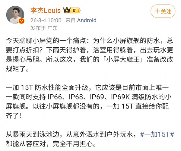 一加中国区总裁李杰最近放了个消息,一加15T这款小屏旗舰,居然同时支持IP66、IP68、IP69、IP69K四种防水等级。