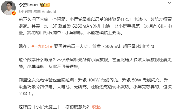 支持,一加15T首发7500mAh超巨量冰川电池,升级100W有线闪充,支持50W无线闪充,升级全场景旁路供电。