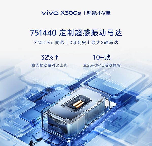 vivo X300s内置了751440定制超感振动马达,这款采用加高设计和特制合金材料的马达,以更小的占板面积实现了超越传统0816马达的综合性能——振动量与1016马达相当,频宽更是传统9595马达的2.2倍,堪称X系列历史上最大最强的振动马达,它支持10余款主流手游的4D游戏振感,振感强弱还可自由定制。