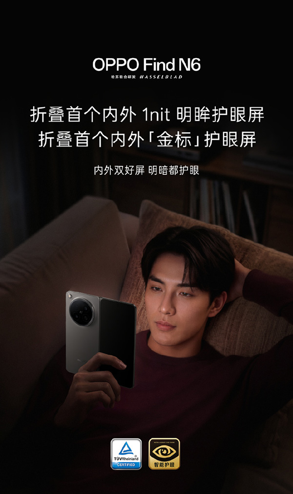OPPO Find N6折叠屏是首款内外1nit明眸护眼屏: