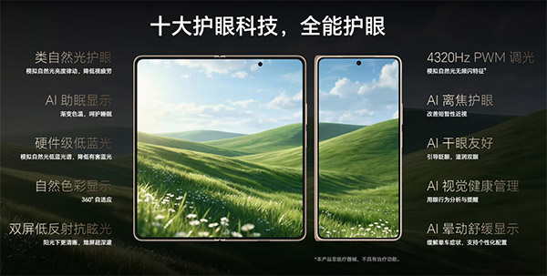 内屏:尺寸是7.95英寸,分辨率是2352×2172(属于1.5K级别),OLED内屏,供应商介京东方,Q10发光材质,全局峰值亮度1300nits,5000nit局部峰值亮度,支持1-120Hz 8T LTPO,低亮度是4320Hz高频PWM调光+中高亮度是类DC调光,支持10.7亿色,荣耀视力舒缓绿洲护眼(干眼友好,离焦视力舒缓),全屏AOD显示,终于有UTG玻璃(宣称折痕比前代改善44%,有SGS 50万次无感知折痕认证),有AR抗反膜,支持手写笔;