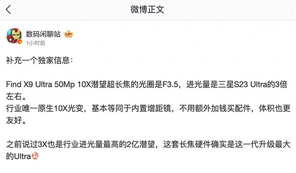 不仅如此,Find X9 Ultra搭载的2亿像素3倍潜望长焦也达到了行业顶尖水准。