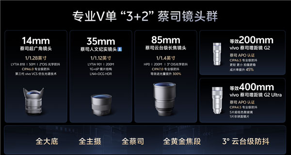 值得一提的是,vivo此次还带来了两款全新增距镜。其中,蔡司增距镜G2等效焦距达200mm,支持CIPA 6.5级防抖。
