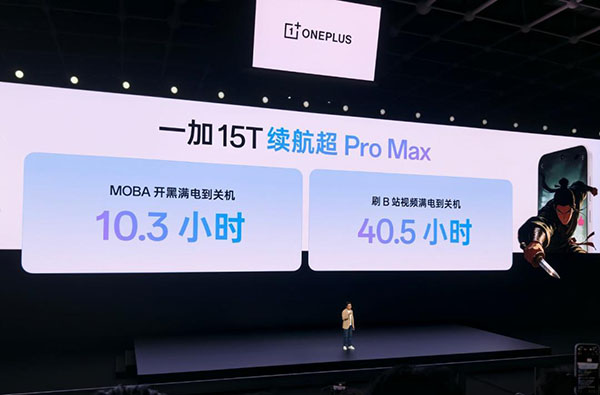 官方数据显示,从满电到关机,一加15T可连续刷B站视频40.5小时,MOBA开黑满电到关机10.3小时,续航超Pro Max。