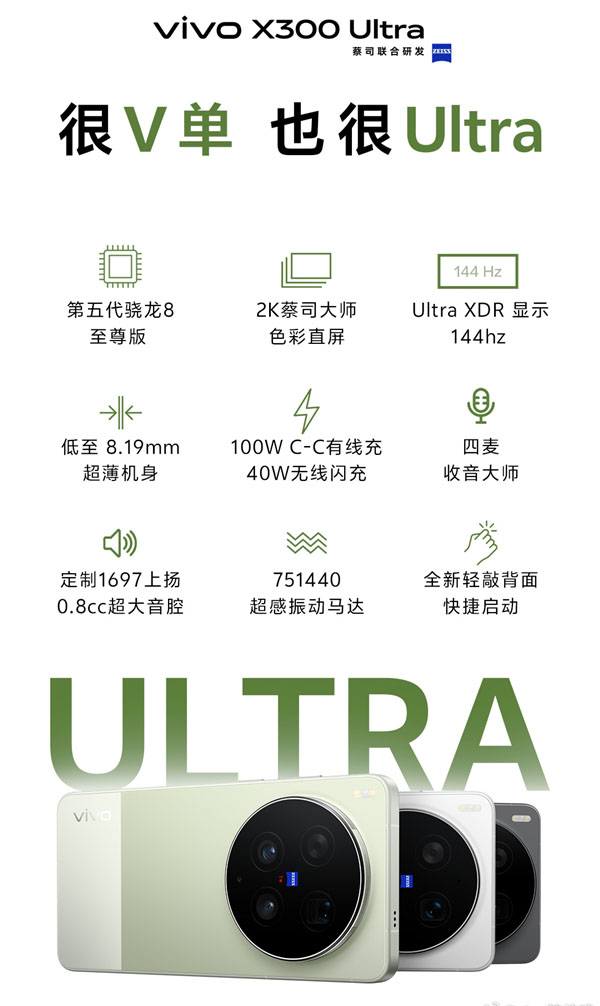 在核心的配置上,这一代的vivo X300 Ultra搭载第五代骁龙8至尊版移动平台,采用蓝厂Ultra首款2K蔡司大师色彩直屏,在色彩还原与显示精度上达到专业级水准。