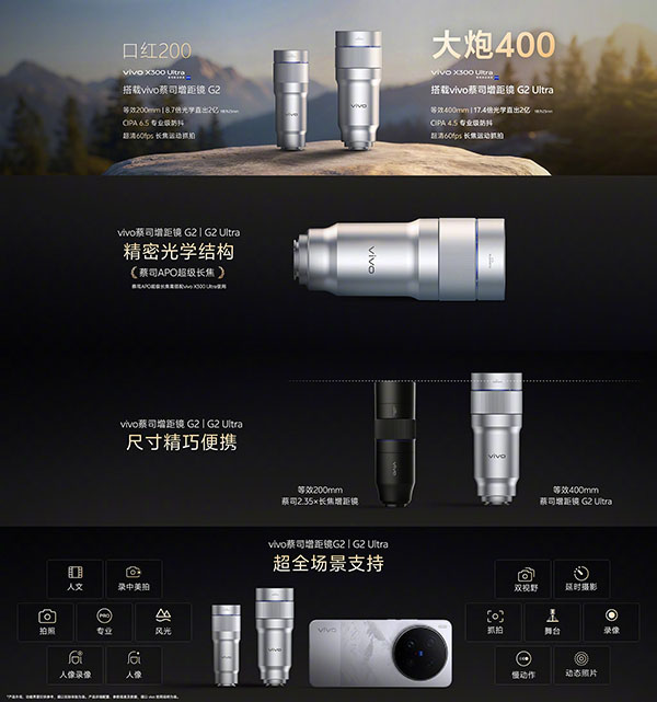 增距镜:vivo蔡司增距镜G2 Ultra(4.7倍光学变焦,等效400mm,最高8100mm变焦),14G+1GM,重248g,还有一个vivo蔡司增距镜G2(2.35倍光学变焦,等效200mm,最高5400mm变焦),15G,重153g;