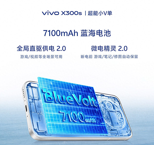 续航方面,vivo X300s搭载7100mAh蓝海电池,并且是单电芯设计,采取第四代硅负极技术,是X系列迄今最大电池容量 与之配套的是全新升级的“全局直驱供电2.0”技术。