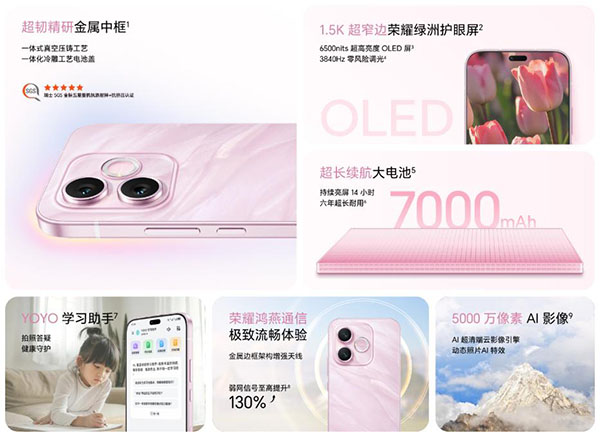性能:首发搭载联发科天玑6500 Elite处理器(CPU2×2.6GHz Cortex-A76+6×2.0GHz Cortex-A55,GPU Mali-G57 MC2),荣耀蜂鸟编译引擎;