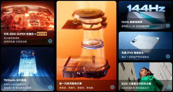 在性能上,该机搭载天玑8500 SUPER处理器,采用台积电4nm先进工艺,CPU为1+3+4全大核架构,最高主频3.4GHz,GPU为ARM G720 MC8@1500MHz,峰值性能提升25%,功耗降低20%,并支持硬件级光线追踪技术与天玑倍帧技术,在高负载环境下能保持满帧运行,同时有效降低功耗。