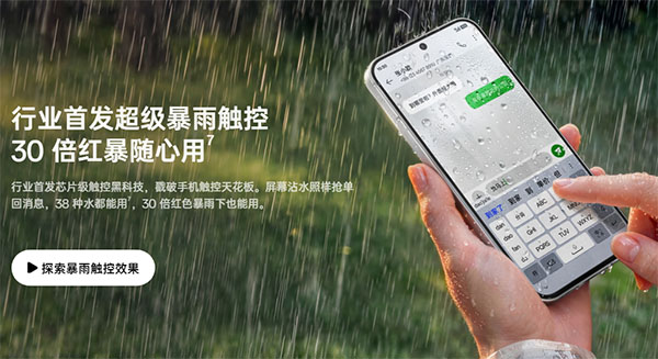 另外,整机支持IP69K/69/68/66满级防水,值得一提的是,该机支持超级暴雨触控,官方称38种水都能用,30倍红色暴雨下也能用,同时支持泥手触控、手套触控,进一步提升户外使用体验。
