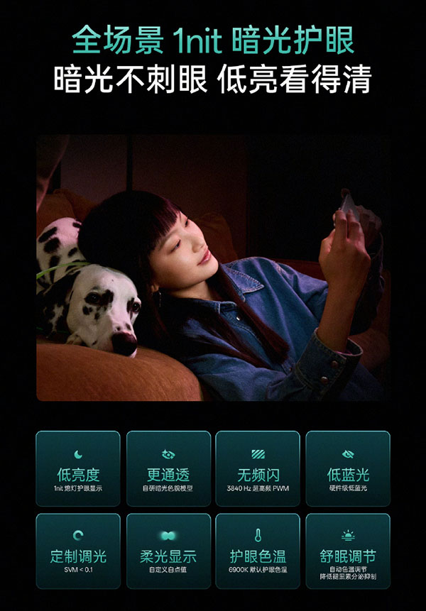 而OPPO推出的1nit明眸护眼屏技术,支持最低1nit的超低亮度显示,能实现“熄灯也护眼”的效果,让用户在深夜等暗光场景下刷社交媒体或阅读时,屏幕光线柔和不刺眼。