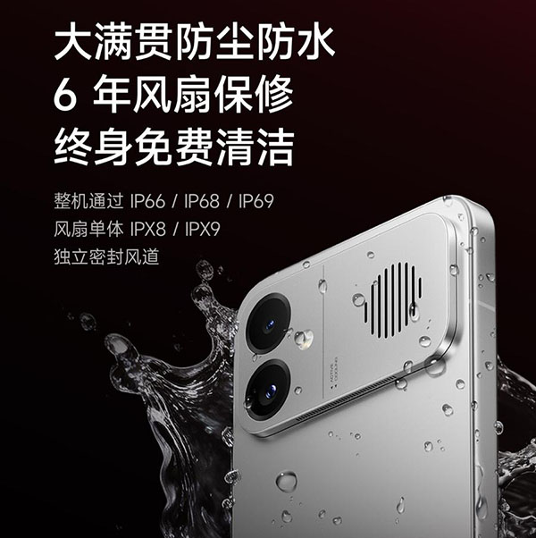散热:6000mm²3D冰封循环冷泵,风冷主动散热,小米系首个+天玑9500首个主动散热风扇,此时体型和风量最大的手机风扇(直径18.1mm,0.42CFM,宣称最大挡位的背面噪音只有32dB);