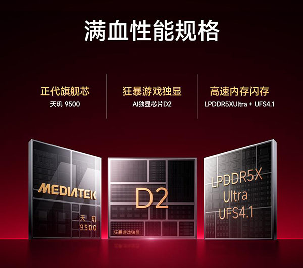 性能:搭载的是天玑9500处理器,狂暴引擎5.0,AI独显芯片D2(12nm制程,全游戏165fps插帧,可1.5K+165fps并发),双T1+信号增强芯片(宣称游戏时延降低20%);