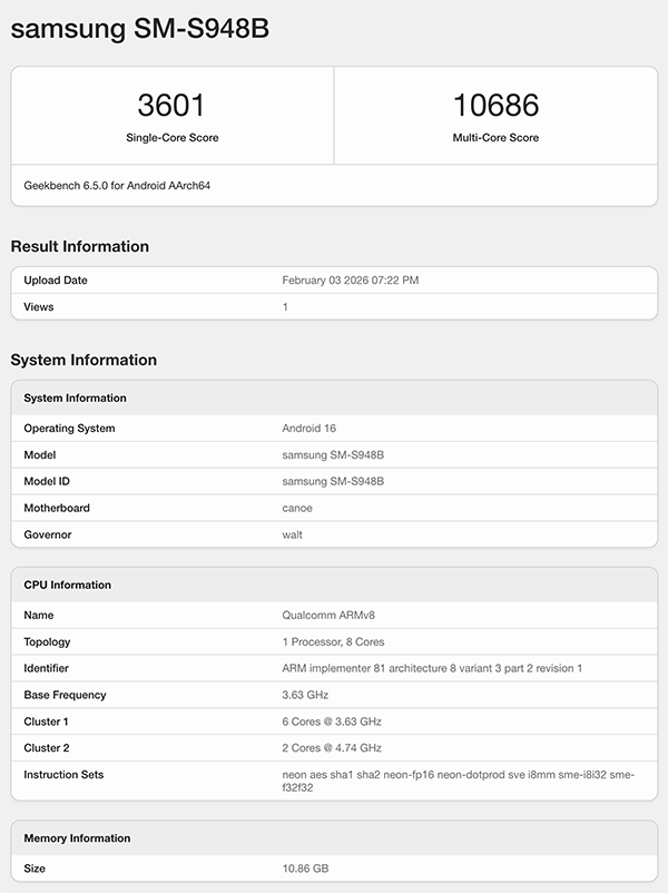 近日,三星Galaxy S26 Ultra Geekbench6跑分公布,首发第五代骁龙8至尊版For Galaxy,也叫第五代骁龙8至尊领先版,单核3601分,多核10686分。