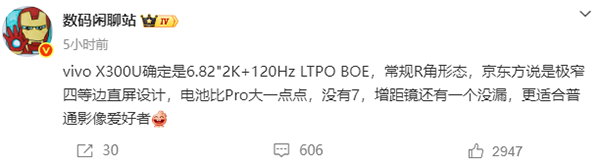在最近要发布的旗舰手机中,这次的vivo X300 Ultra可以说也是备受关注了,这个手机也是陆续在各大博主那里预热了,根据最近的相关确定消息,vivo X300 Ultra采用2K分辨率京东方提供的极窄四等边直屏。
