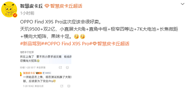 再一个就是,OPPO Find X9s Pro搭载天玑9500处理器,正面是一块6.32英寸1.5K分辨率直屏,另外也补齐了上代小屏机没有的超声波指纹。