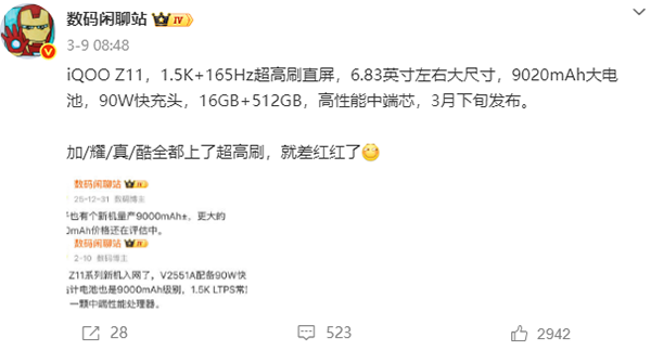 iQOO 产品经理邢程@行走的橙子Q此前透露,iQOO Z11将成为iQOO首个165Hz电竞屏和iQOO最大9020mAh电池双越级首发的产品。
