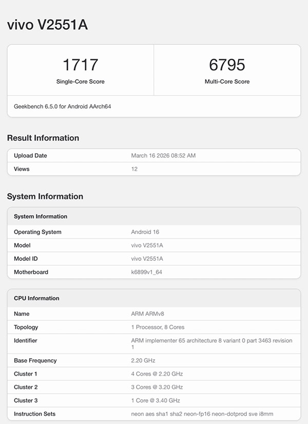iQOO Z11在Geekbench6跑分出炉,型号V2551,搭载天玑8500满血版,单核1717分,多核6795分。