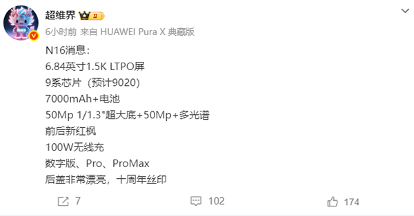 续航上,华为nova16系列将内置超过7000mAh的超大电池,支持100W的无线充电。