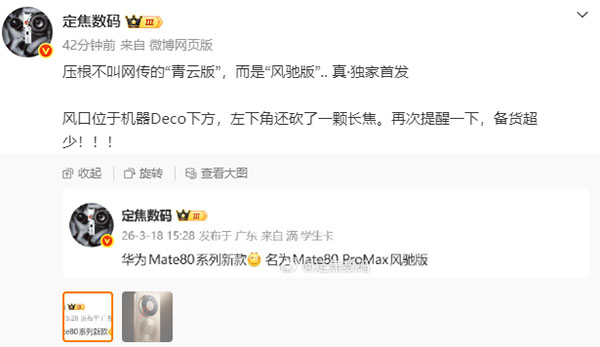 根据博主“定焦数码”爆料称华为Mate80系列的新成员Mate80 Pro Max风驰版“暂时只在生活馆和直营店销售”,暗示前期备货量可能不大。