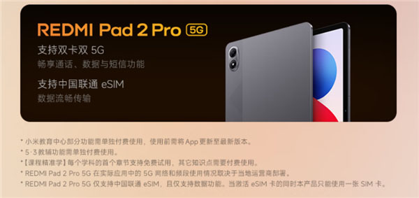 据介绍,REDMI Pad2 Pro 5G支持双卡双5G,支持通话、数据与短信功能,仅支持中国联通eSIM,且仅支持数据功能。