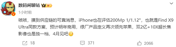 根据知名博主的爆料,苹果正在评估测试2亿像素1/1.12英寸主摄传感器方案,也就是索尼LYT901超大底主摄,该方案正是即将于4月发布的OPPO Find X9 Ultra所搭载的影像主摄型号了。