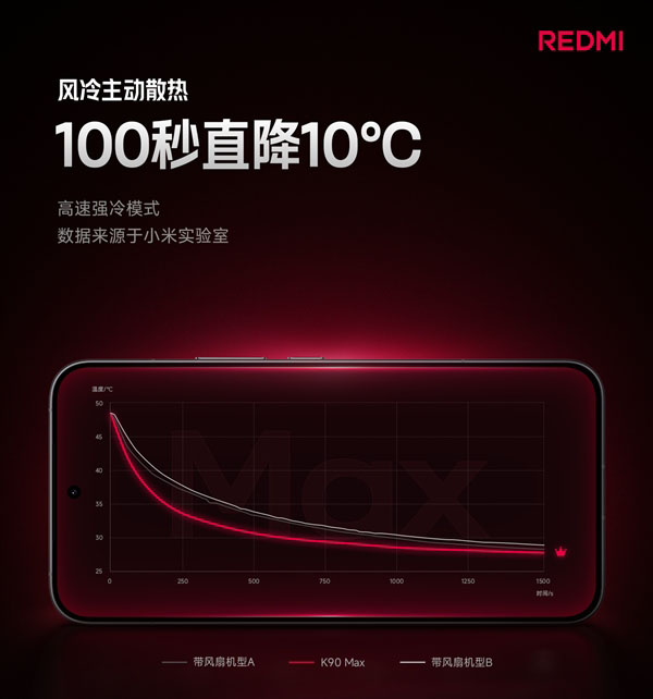根据REDMI产品经理胡馨心透露,该机可以实现100秒直降10℃(48℃-38℃)。
