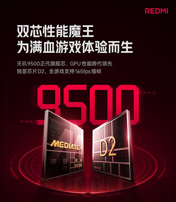 从整体的定位上来看, 这次的红米K90 Max定位的是性能魔王,主打极致游戏体验,在这个核心配置,K90 Max搭载天玑9500+独显芯片D2双芯组合,支持全游戏165fps插帧。