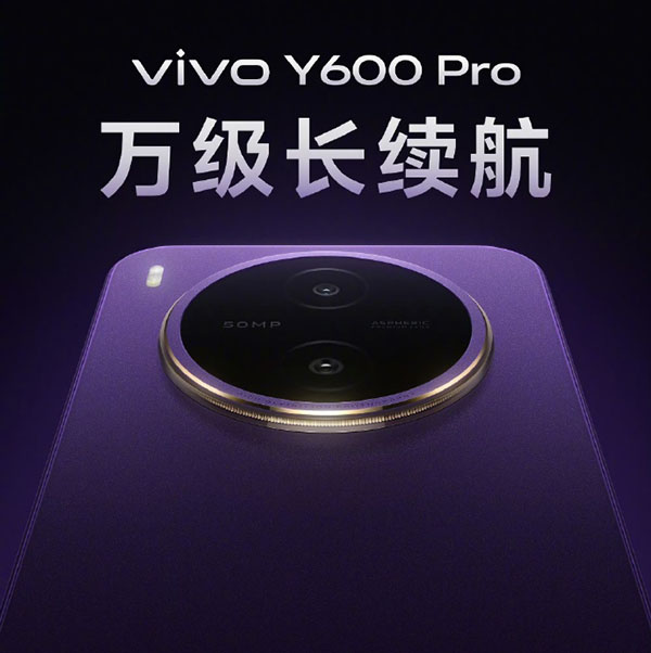 外观设计方面,从官方海报可见,Y600 Pro延续了Y系列标志性的圆形星环影像模组设计,后置双摄,主摄像头为5000万像素,机身将提供全新的紫色配色。